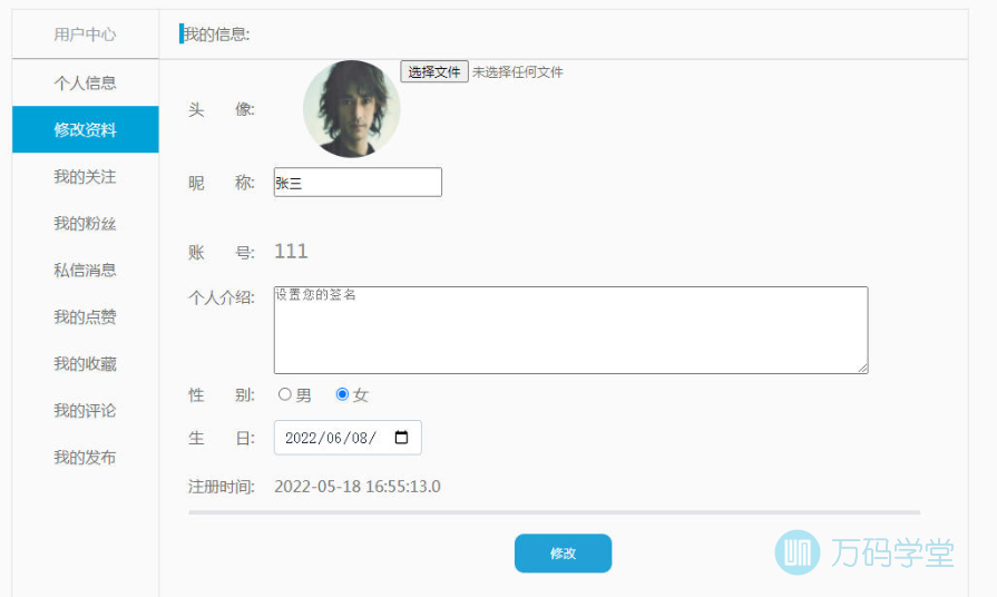 修改资料:个人头像、昵称、介绍、性别、生日等信息的修改。