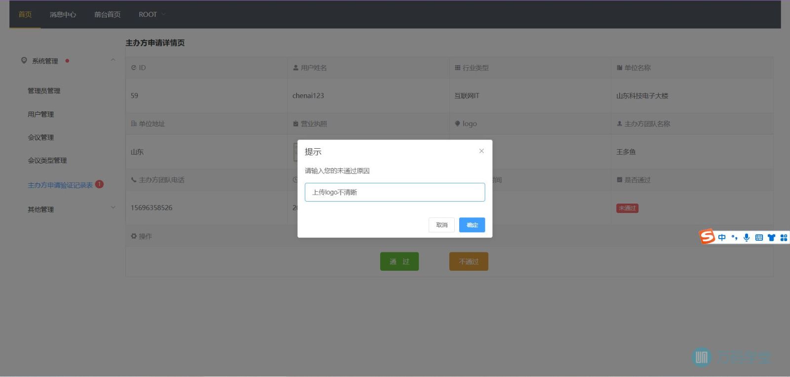 主办方的管理:对申请的主办方记录进行处理验证,给予通过或不通过的处理,并为主办方的处理界面有专门的细节展示页面。