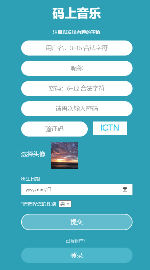 用户可以在此界面进行账号的登录以及注册,注册时会进行头像预览,如果用户不想马上选择头像的话,会提供一个默认头像。