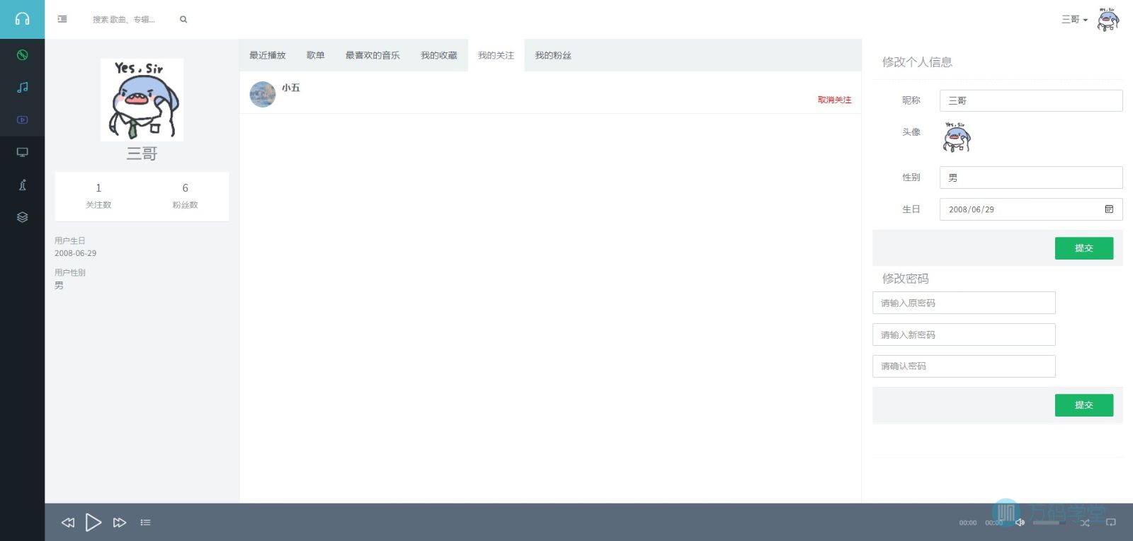 2、 用户登录进去之后可以在右上角头像的个人中心按钮,进入个人中心界面。在个人中心界面可以查看自己粉丝用户及粉丝数量,自己的关注用户及关注数量,个人歌单,喜欢的音乐,收藏等等。还可以对个人信息进行修改,密码的修改。