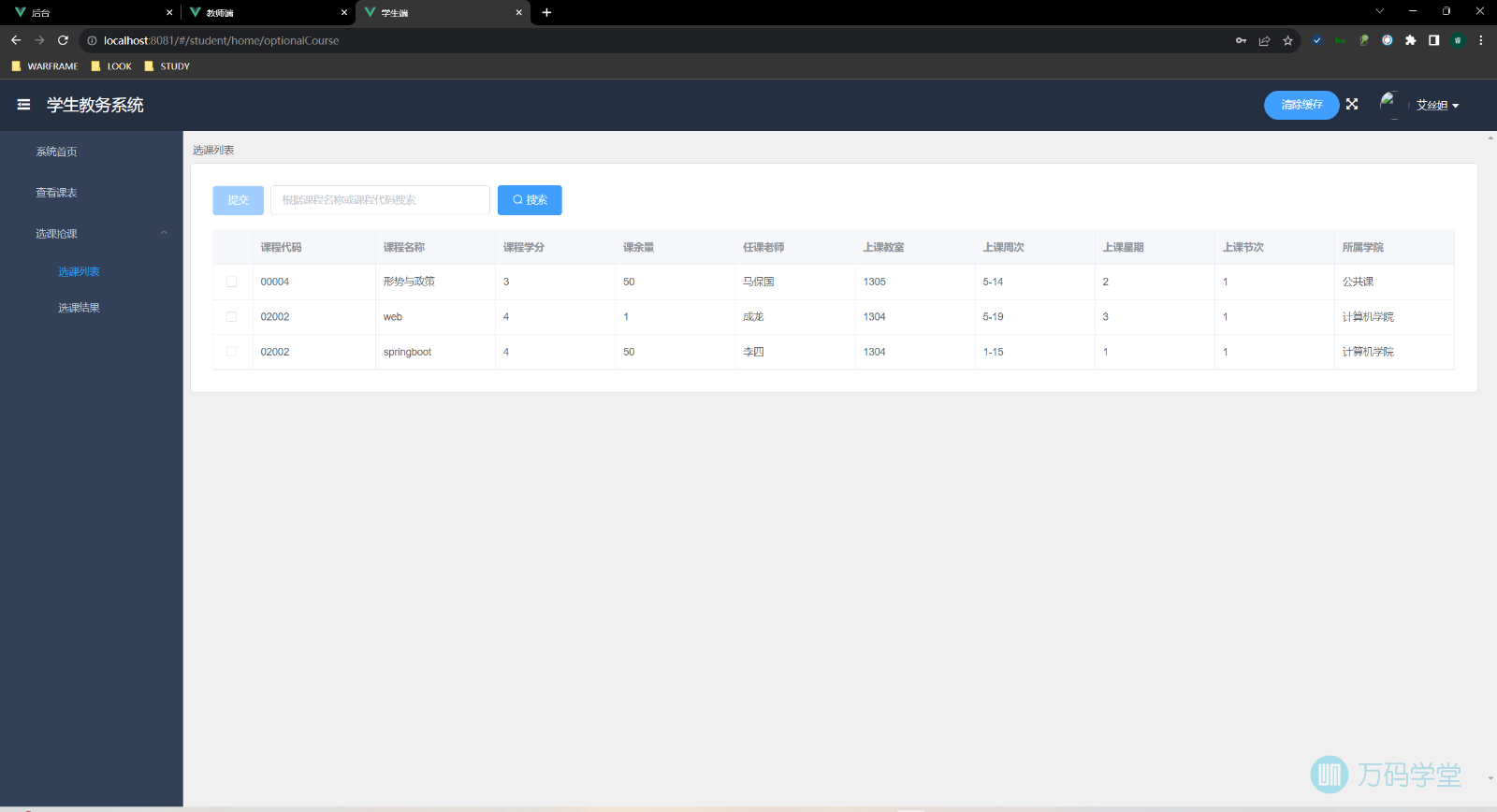3、本项目主要使用了SpringBoot、Mybatis-Plus、Redis、MySQL、JWT、Vue等,设计了后台端、教师端、学生端三端页面,主要实现了后台对教师、学院等的各项管理,查看操作日志;教师对专业、课程、学生的各项管理,对各门课程进行排课;学生可查看教师排完的课表,进行选修课抢课。
