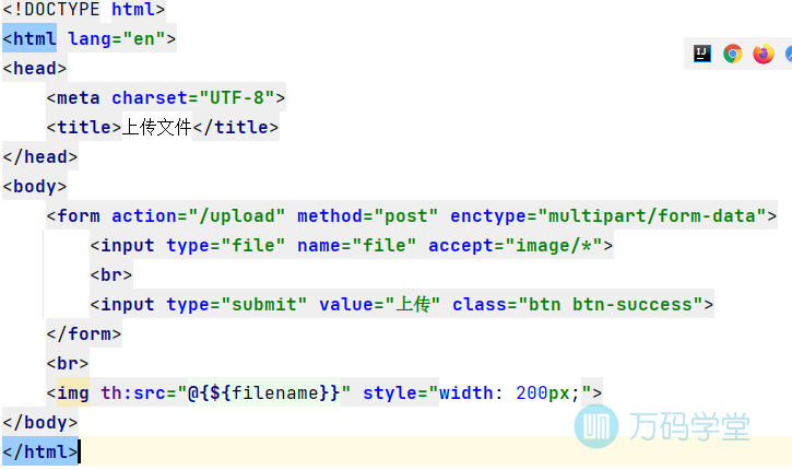 并在控制器中添加两个upload方法,第一个upload用于访问upload.html页面,第二个upload方法用于页面提交表单后上传图片并返回到upload.html页面。