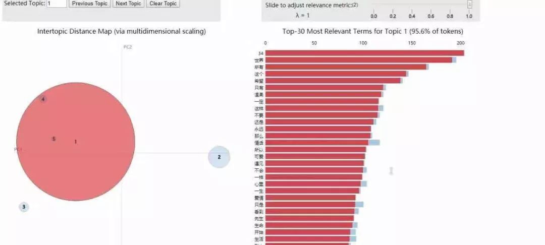 在 Python 中,有直接实现了 LDA 的库 pyLDAvis,我们只需要指定单词个数上限和主题个数等参数即可,同时 pyLDAvis 也提供了非常好的动态交互可视化界面的 API。